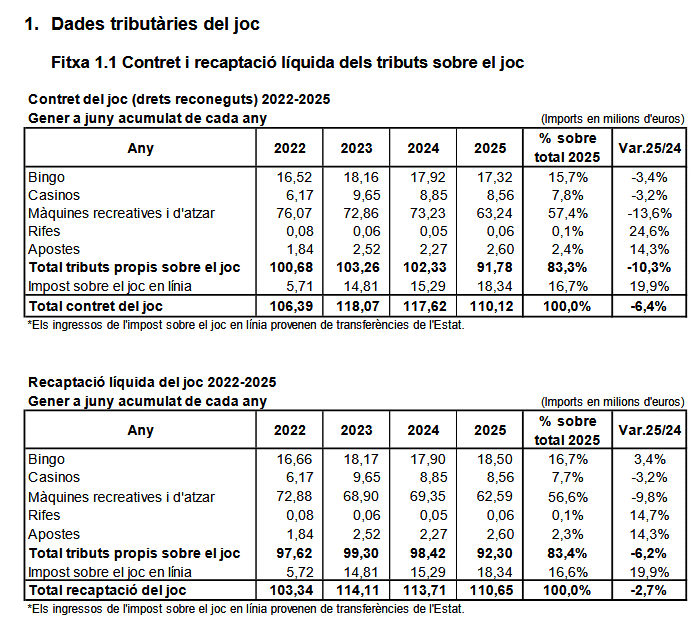 Según los datos del primer semestre del año la recaudación de los tributos sobre el juego en Cataluña disminuyó respecto a 2024.