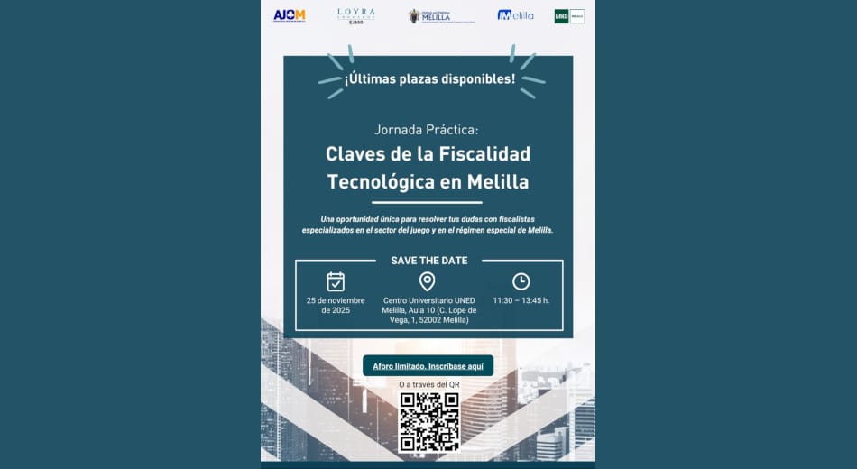 La Asociación de Juego Online de Melilla (AJOM), dentro del convenio de colaboración suscrito con la Consejería de Innovación Tecnológica, organiza la jornada práctica “Claves de la fiscalidad tecnológica en Melilla”, que se celebrará el próximo 25 de noviembre de 2025 en el Centro Universitario UNED Melilla. Esta iniciativa tiene como propósito reforzar el conocimiento especializado sobre el régimen fiscal propio de la ciudad y su relevancia para las empresas tecnológicas, los operadores del sector del juego online y los profesionales vinculados al ámbito económico y jurídico.