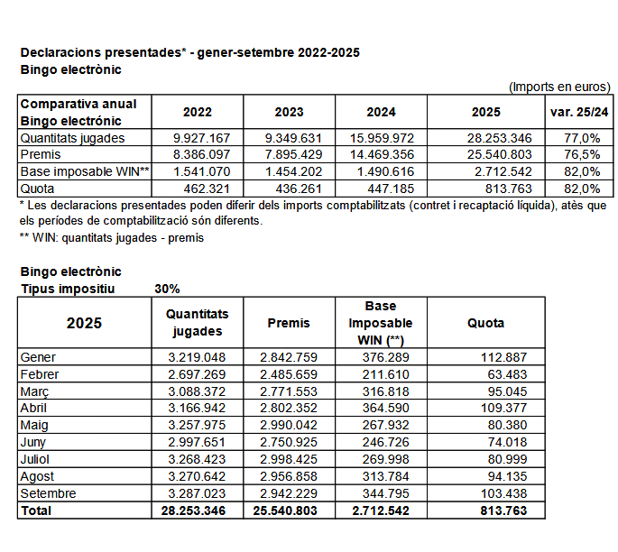 El Bingo Electrónico en Cataluña está en auge. Las cantidades jugadas han aumentado un 77% según el Informe hasta septiembre de 2025 de la Dirección General de Tributos y Juego de la Generalitat.