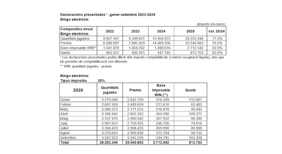 El Bingo Electrónico en Cataluña está en auge. Las cantidades jugadas han aumentado un 77% según el Informe hasta septiembre de 2025 de la Dirección General de Tributos y Juego de la Generalitat.