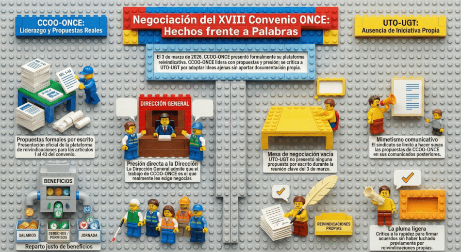 CCOO-ONCE puede detallar —y lo hará— cuáles son las cuestiones que considera fundamentales en la negociación de un Convenio. Por eso hemos publicado siempre nuestras plataformas de negociación y nuestros programas en cada proceso electoral sindical.Otros, en cambio, han optado durante años por no hacer públicas sus propuestas y presentar como propias, una vez firmado el acuerdo con la Dirección, todos los avances recogidos en el Convenio.