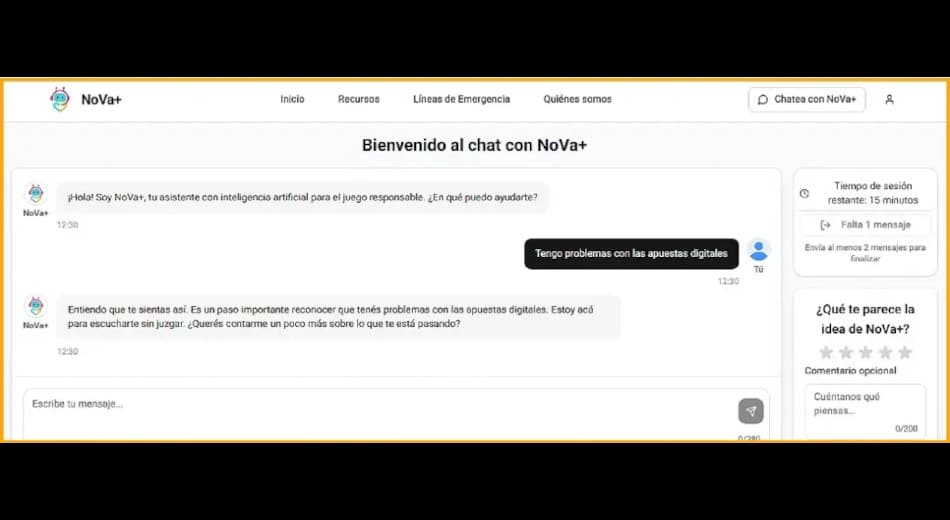 NoVa+ propone un espacio de escucha activa mediante conversaciones de hasta 15 minutos, en las que proporciona consejos prácticos como establecer límites de tiempo y dinero, evitar el juego en momentos de vulnerabilidad emocional, no recurrir a préstamos y mantener actividades recreativas alternativas.