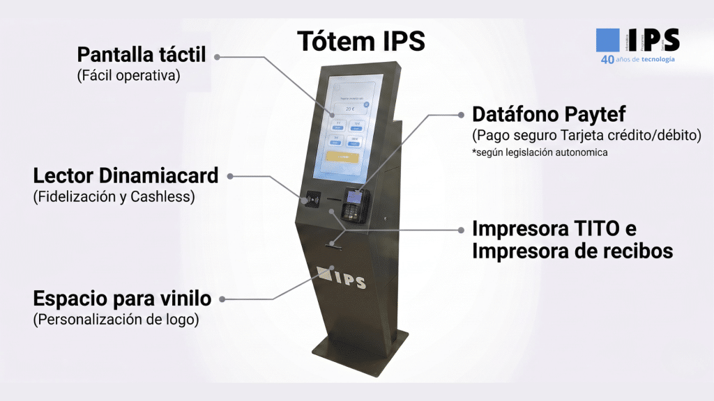 Tótem IPS permite la compra de créditos de juego mediante tarjeta, la emisión de tickets TITO y una operativa 100 % autónoma para el cliente. Al mismo tiempo, aporta al operador herramientas de gestión y control, como el seguimiento del histórico de operaciones, facilidades para la recaudación y compatibilidad con máquinas de cambio.
